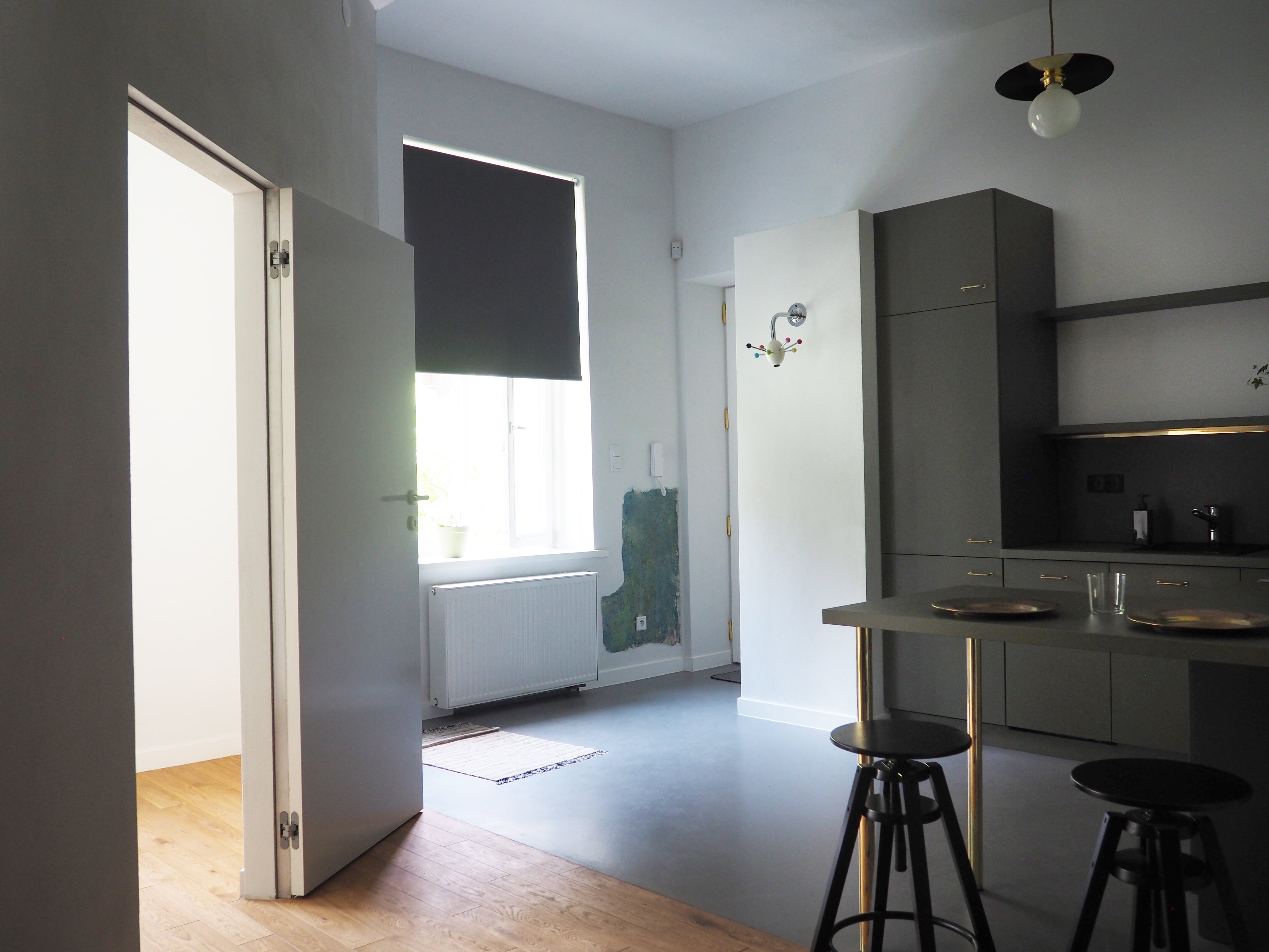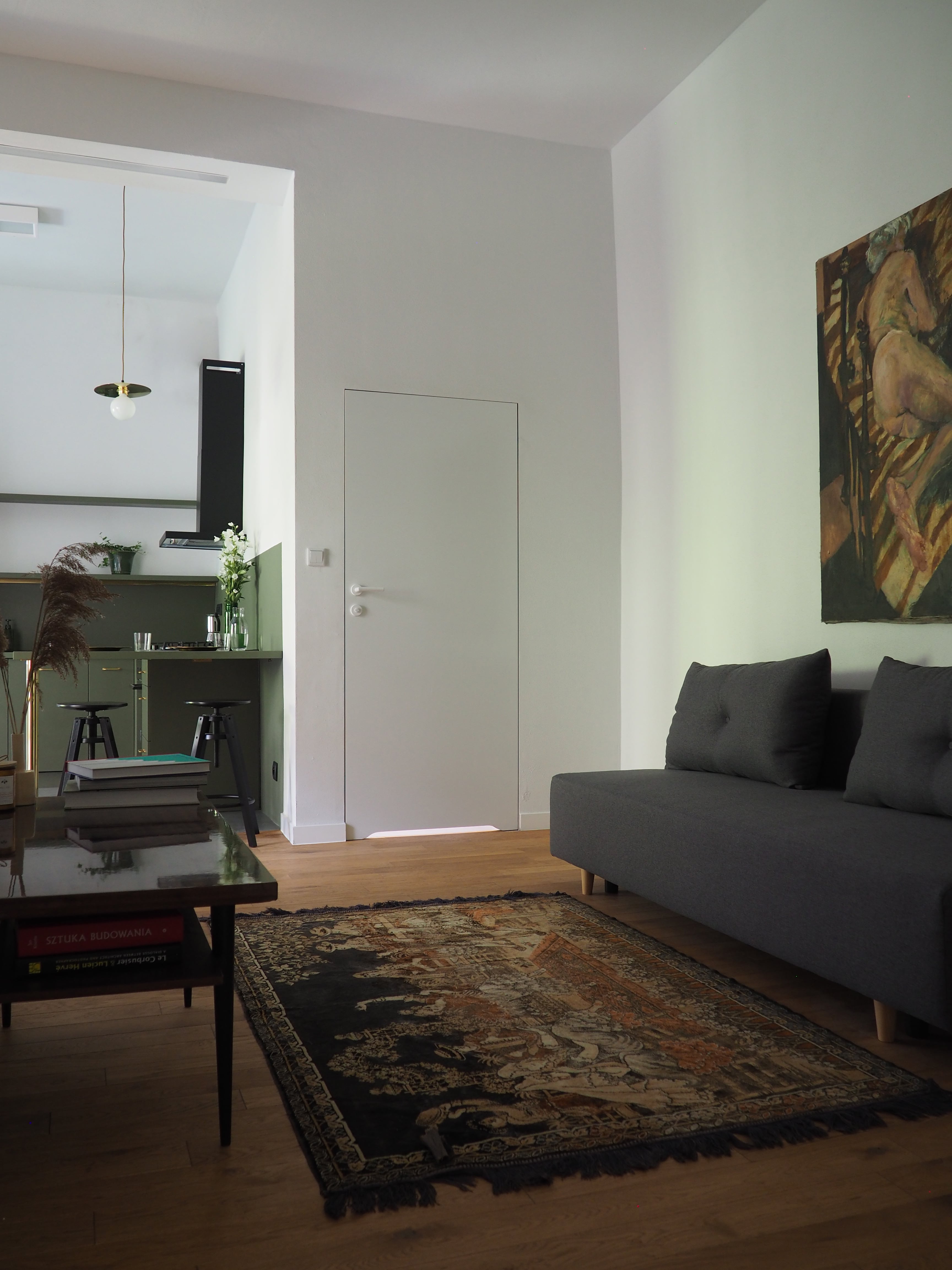 Mieszkanie na wynajem w jednej z krakowskich kamienic. Mieszkanie zostało przearanżowane z jedno pokojowego na dwu pokojowe. Została zastosowana gra kolorów nawiązująca do odkrytego na miejscu fresku. Przeważa styl nowoczesny oraz dodatki vintage.